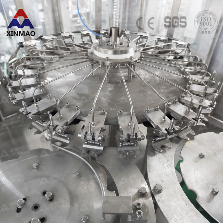 中型純凈水灌裝機瓶子由通過風送道傳遞,然后通過撥瓶星輪傳送至三合一機的沖瓶機。沖瓶機回轉盤上裝有瓶夾,瓶夾夾住瓶口沿一導軌翻轉180°,使瓶口向下。在沖瓶機特定區域,沖瓶夾噴嘴噴出沖瓶水,對瓶子內壁進行沖洗。瓶子經沖洗、瀝干后在瓶夾夾持下沿導軌再翻轉180°,使瓶口向上。洗凈后的瓶子通過撥瓶星輪由沖瓶機導出并傳送至灌裝機。進入灌裝機的瓶子由瓶頸托板卡住并在凸輪作用下將瓶子上升,然后由瓶口將灌裝閥頂開。灌裝采用重力灌裝方式。灌裝閥打開后物料通過灌裝閥完成灌裝過程,灌裝結束后瓶口下降離開灌裝閥,瓶子通過卡瓶頸過渡撥輪進入旋蓋機。旋蓋機上的止旋刀卡住瓶頸部位,保持瓶子直立并防止旋轉。旋蓋頭在旋蓋機上保持公轉并自轉,在凸輪作用下實現抓蓋、套蓋、旋蓋、脫蓋動作,完成整個封蓋過程。成品瓶通過出瓶撥輪從旋蓋機傳送到出瓶輸送鏈上,由輸送鏈傳送出三合一機。
