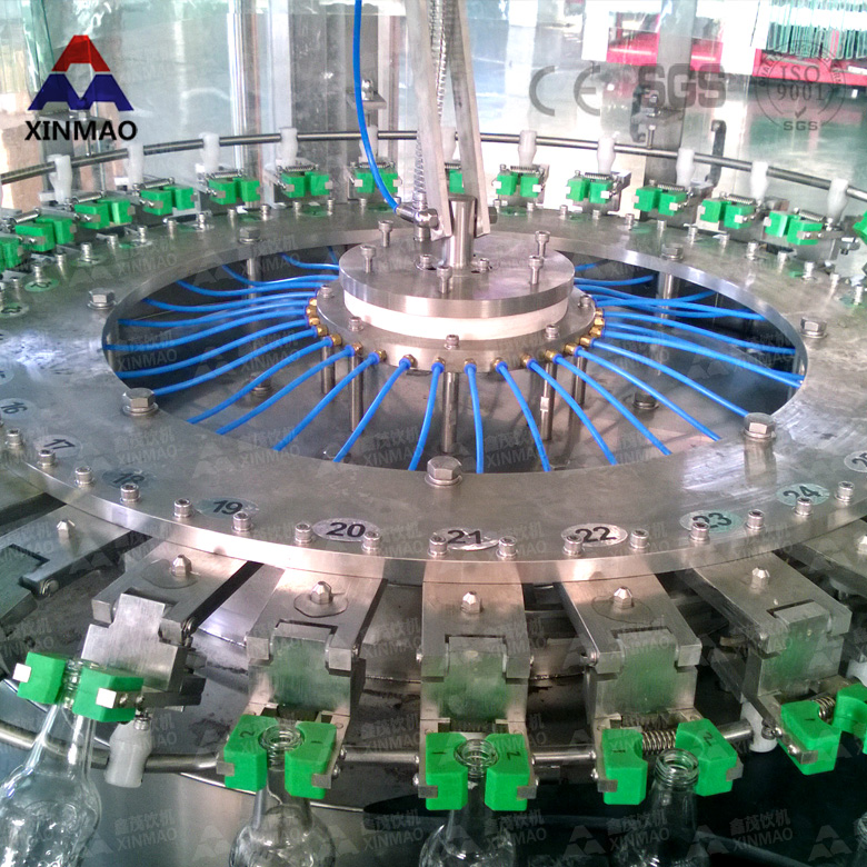 玻璃瓶三合一雞尾酒灌裝機機組內部一次完成洗瓶、灌裝、封蓋三道工序,瓶子磨損小、傳動準確平穩、瓶型更換便捷。 特殊設計的沖瓶機瓶夾結實耐用,不接觸瓶口螺紋部位,避免瓶口二次污染。 與液體接觸的零部件全采用優質不銹鋼材料或食品級工程塑料,符合國家食品衛生標準 。 出瓶撥輪瓶底托板采用螺旋下降方式,變換瓶型無須調整出瓶輸送鏈高度。玻璃瓶三合一雞尾酒灌裝機在吸收國外先進技術的基礎上研制設計而成的,在一體機上實現沖洗、灌裝、旋蓋的功能,主要用于玻璃瓶含氣飲料如汽水、可樂、雞尾酒的生產。