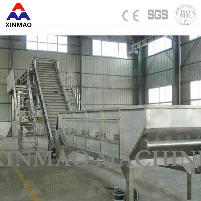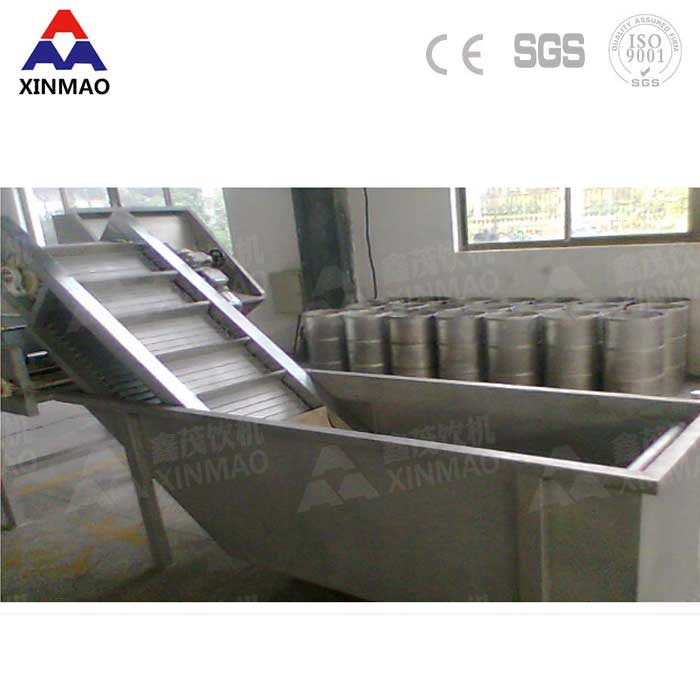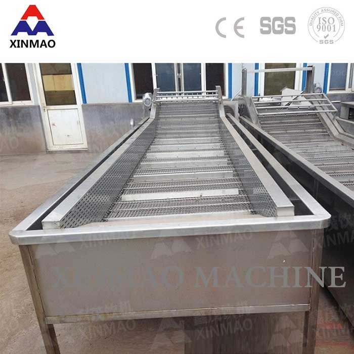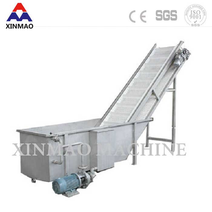 物料落入水中,利用槽體中翻騰的水將物料攪動清洗,物料上帶有的泥沙等重污物脫離后落入過濾網(wǎng)下面的沉淀區(qū),物料在水的推動下逐漸移動到輸送網(wǎng)帶上,被提升出內(nèi)槽體,再經(jīng)過噴淋清洗,將物料二次洗凈,進入下面的工序。清洗下來的漂洗物,經(jīng)過濾網(wǎng)攔截。工作過程中,進水管和噴淋水管始終供水,使水箱內(nèi)的污水逐步被替換。