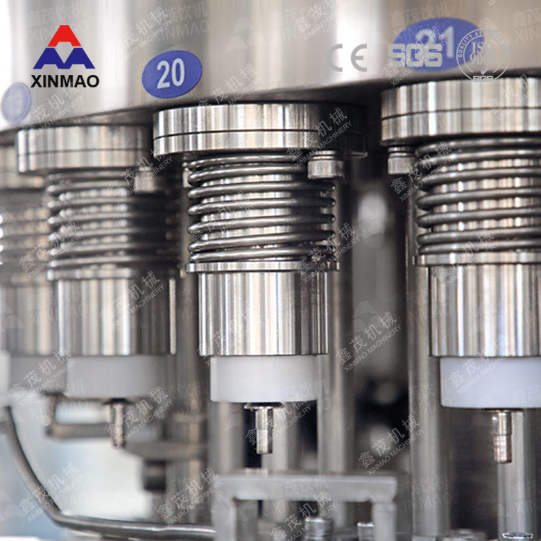 純凈水灌裝設備灌裝部分實現將物料灌裝到由沖瓶機送過來的洗好的瓶子中。