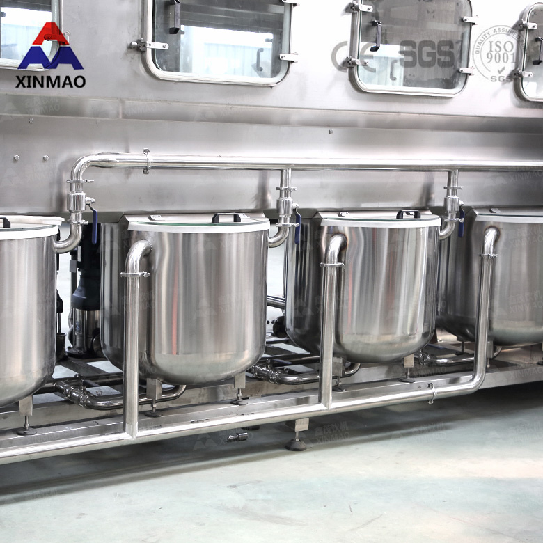 外刷桶部分主要由機架、1個推瓶氣缸、前后擋瓶氣缸、刷桶傳動電機、刷桶水泵、光電檢測開關等組成。由洗瓶灌裝機的PLC(可編程控制器)統一控制,本機為原水沖洗,在獨特的瓶型毛刷的幫助下可充分去除瓶勁及瓶身上的污跡。本機的工作流程為光電檢測開關連續檢測到2個瓶后,擋瓶氣缸動作,隨后推瓶氣缸動作,裝在汽缸頂部的滾輪卡住瓶身,同時噴水管開始噴水,電機帶動瓶型毛刷轉動,對瓶身和瓶勁進行清洗。清洗一定時間后,汽缸回縮,噴水管停止噴水進瓶輸送鏈轉動,將瓶送到上瓶機。