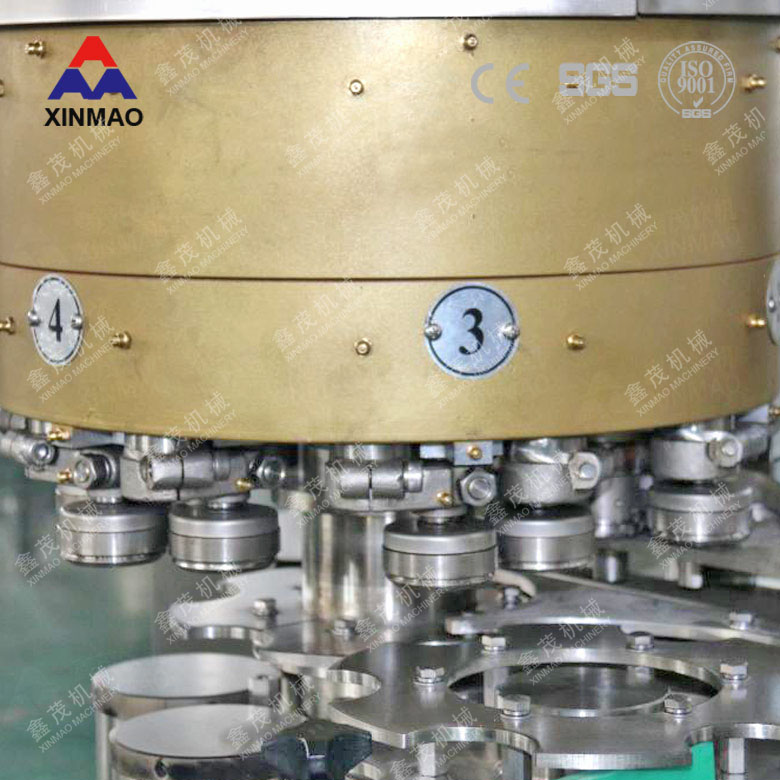 易拉罐含氣飲料灌裝設(shè)備采用等壓灌裝原理,當空罐經(jīng)撥輪進入升降托罐盤后,灌裝閥和空罐對中,空罐升起并密封,同時自動打開灌裝閥的閥口,當灌裝液面堵住閥的回氣管口時停止灌裝。灌好的罐子經(jīng)鉤子鏈送到封口機頭,蓋子經(jīng)送蓋器及壓頭把蓋子送到罐口上,當托罐機構(gòu)升起時,壓頭壓緊罐口,封口輪先預(yù)封再實封,罐子封好后被打蓋機構(gòu)的打頭推出,然后進入出罐輸送。