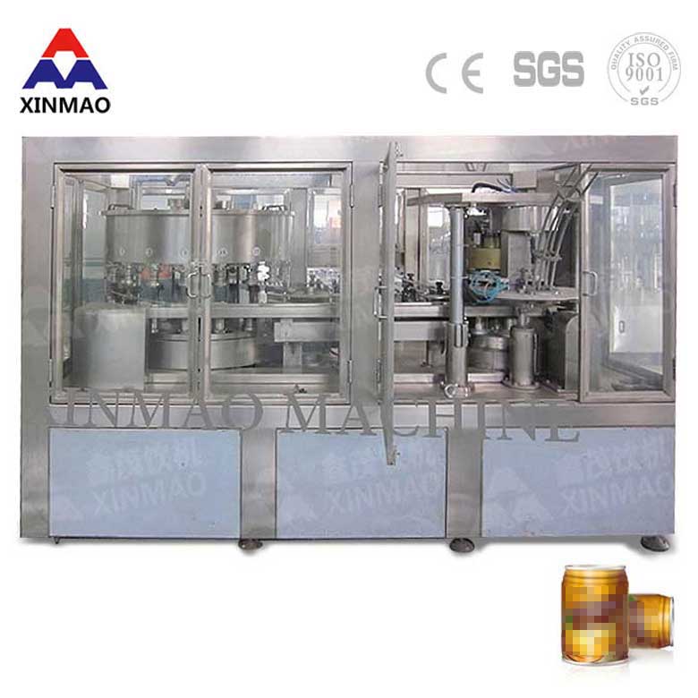 本機是在消化吸收國內外(不含汽)易拉罐灌裝封罐機(封口機)的基礎上張家港鑫茂開發的設備。采用常壓灌裝原理,當空罐經撥輪進入升降托罐盤后,灌裝閥和空罐對中,空罐升起并密封,同時自動打開灌裝閥的閥口,當灌裝液面堵住閥的回氣管口時停止灌裝。灌好的罐子經鉤子鏈送到封口機頭,蓋子經送蓋器及壓頭把蓋子送到罐口上,當托罐機構升起時,壓頭壓緊罐口,封口輪先預封再實封,罐子封好后被打蓋機構的打頭推出,然后進入出罐輸送。